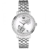 A flirty and fun feminine timepiece. Round sunray white face with silver tone casing encrusted with crystals around the edge. Crystal embellished butterflies on face. Shiny silver tone metal adjustable link band. Water resistant Domestic and/or imported Women's Accessories > Watches > Guess Watches